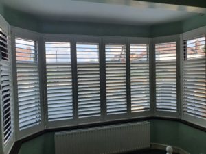 2 large bay windows fitted with Scraft shutters in Cockfosters Scraft shutters with 76mm louvres, silent tilt and split tilt fit to these 2 large bays upstairs and downstairs. A high quality long lasting solution for your home!