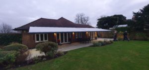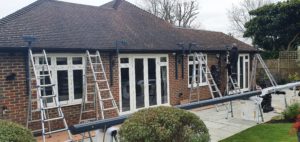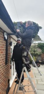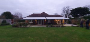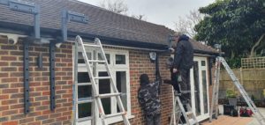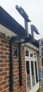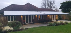 2 Giant folding arm awnings fitted in Whetstone in London on quality bespoke spreader plates to elevate the awnings above the gutter line.
