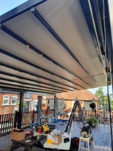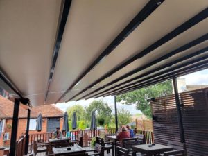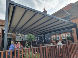 2 Weinor Pergotex systems fitted side by side at The Black Lion Pub in Epping High St. This high quality system has been installed on a free standing goal post system to create an outdoor area spanning 10m x 5m. Fully windproof and waterproof with a built in gutter. Fully integrated LED’s and Weinor tempura heaters. This system will provide the perfect outdoor space for alfresco wining and dining all year round.
