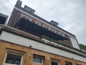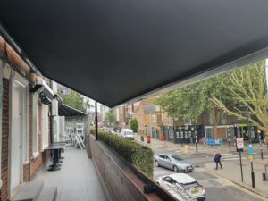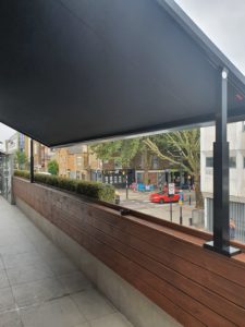Weinor Plaza Viva fitted on the balcony for the well known Chapel Bar Restaurant in Islington. The Plaza Viva system provides shelter from sun, wind and rain and will provide this restaurant with the perfect outdoor area for their customers for many years to come. Fully retractable with a remote control or can be added to a home automation system if required.